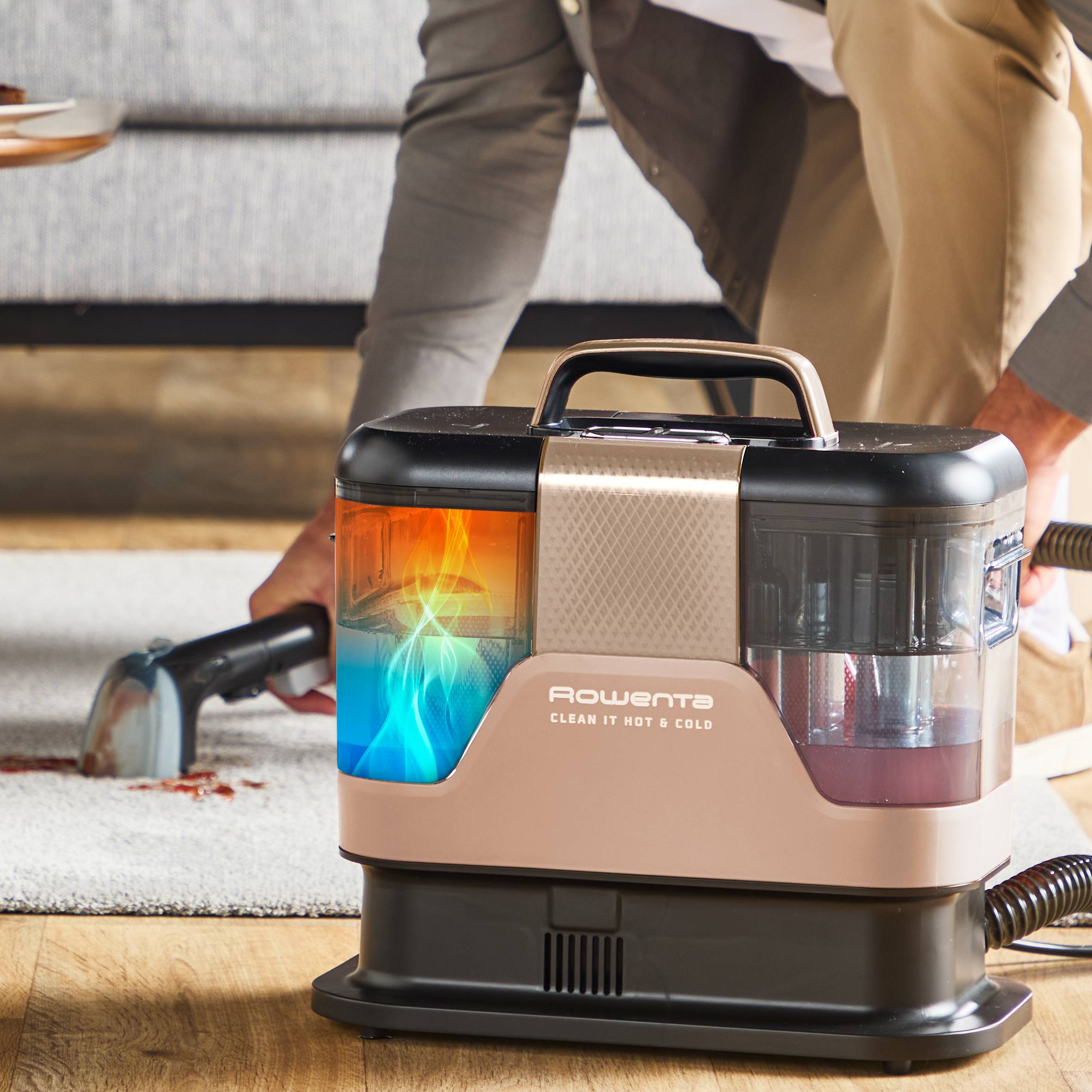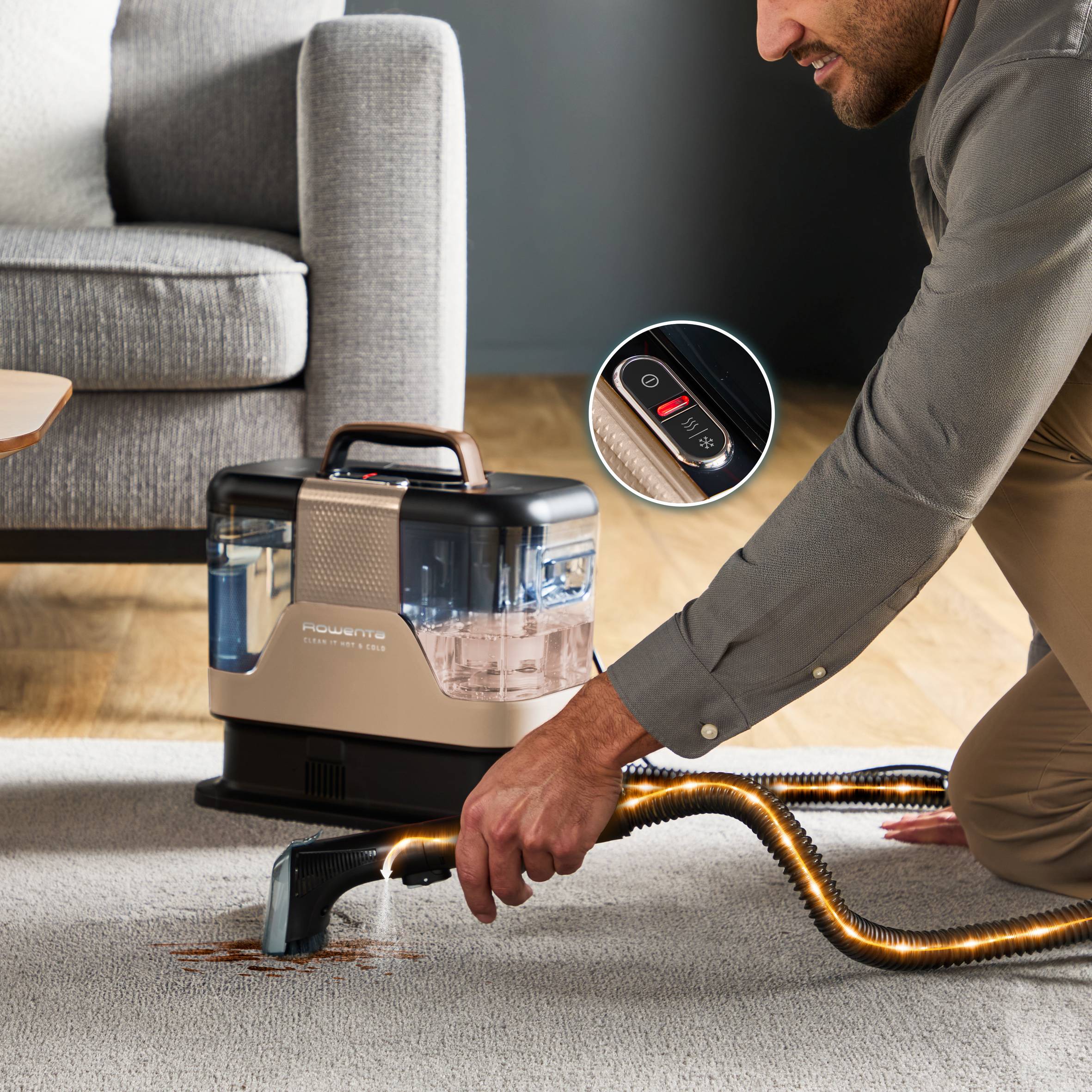 Entdecken Sie den Clean It Hot & Cold von Rowenta, die Komplettlösung für hartnäckige Flecken, die Ihnen täglich eine professionelle Reinigung ermöglicht. Ob schlammige Pfotenabdrücke, verschüttete Säfte oder mysteriöse Flecken von kleinen Händen: Die beiden Reinigungsmodi des Clean It bewältigen jede Art von Verschmutzung durch die richtige Temperatur für jeden Fleck – egal ob heiß oder kalt.